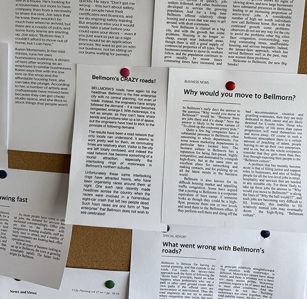 Real cities are shaped partly by individual decisions and partly by plans generated by authorities at the different levels of government. The Bellmorn installation exhibits five stages of development of a simulated city whose evolution is shaped entirely by individual decisions.