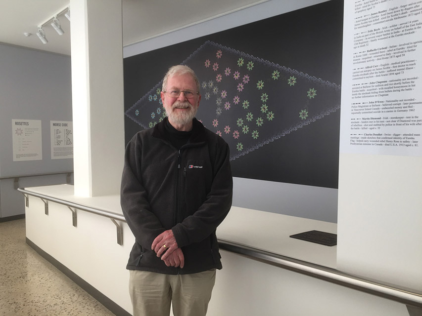 In making the work I wished to honour the individuality of those involved in the Eureka events, but also to represent in some way the greater forces, social and technological, that had these individuals in their grip. The main part of the work is a large abstract print based on a mathematical construction called an Ammann-Beenker tiling. This never repeats, but is not random; it is based on definite rules, but it is hard to see what they are; a metaphor for the larger pattern the individuals of Eureka were enmeshed in. I chose this specific pattern because it includes whole and fragmented eight-pointed stars. The Eureka flag, the central symbolic artefact of the rebellion, flown by the rebels at Eureka and now displayed at the Eureka Centre, has eight-pointed stars.