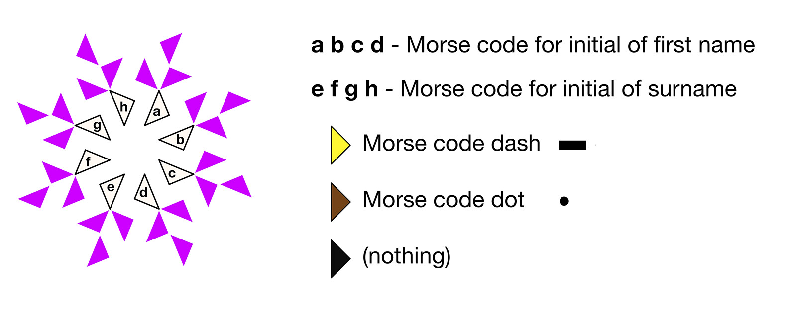 For each of the 75 individuals represented in the work I have provided an extremely short and "telegraphic" biographical note. Each individual is also represented by a coloured "rosette" in the large print; the rosette has encoded in it the Morse code for the initials of the individual. There is also a key to Morse code, so the rosette can be connected with the biography of the person it represents.