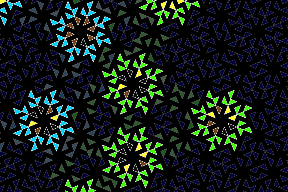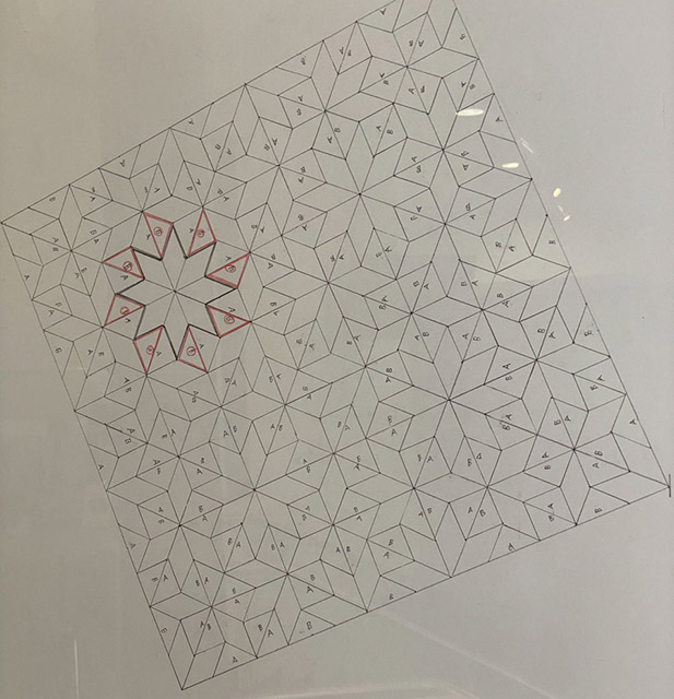 The pattern underlying the main panel of the work is also used in the print Alogos: Maze of Triangles.