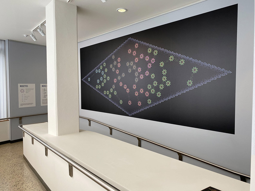 Materials: Digital print 213 x 500 cm, printed as vinyl wall-hanging. Panel 80 x 160 cm with 75 short biographies. Preliminary drawing, pencil on card, 63 x 51 cm (exhibited as part of the installation). Key to Morse code and the rosettes.