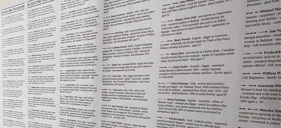 Anthony Camm, who leads the Eureka Centre, has described Eureka as a meso-scale event: not just the concern of a few individuals or a single family, but not so large as to involve whole nations either. Many names of individuals involved are known, and in some cases extensive biographical detail.