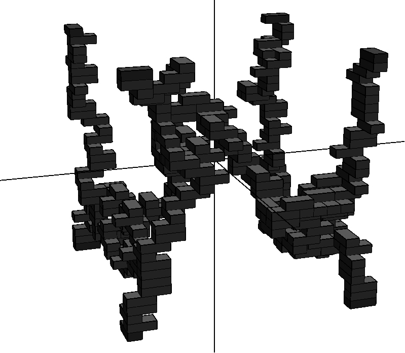 Step 1: Add bricks. Place 2 x 4 Lego bricks at random in a 29cm x 29cm x 29cm cube, until no more will fit.