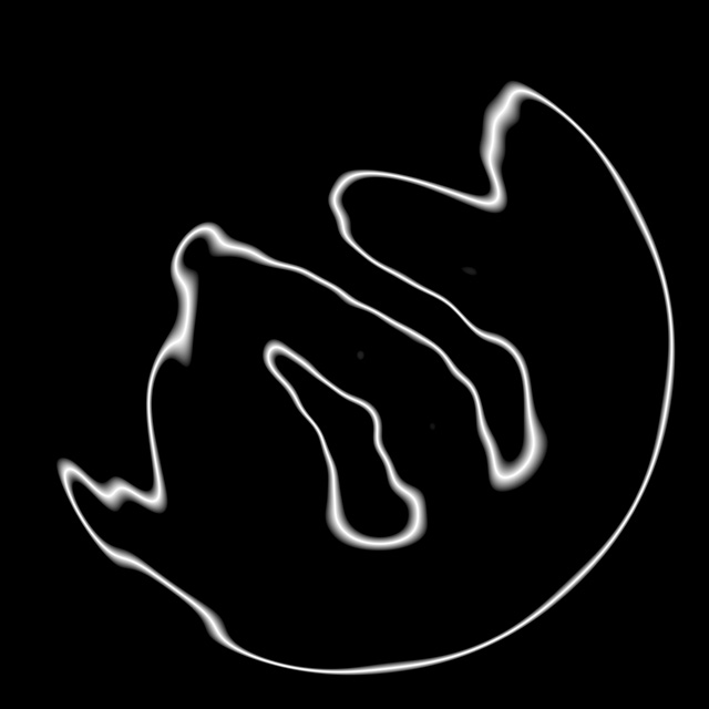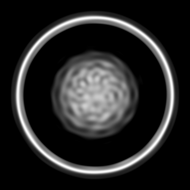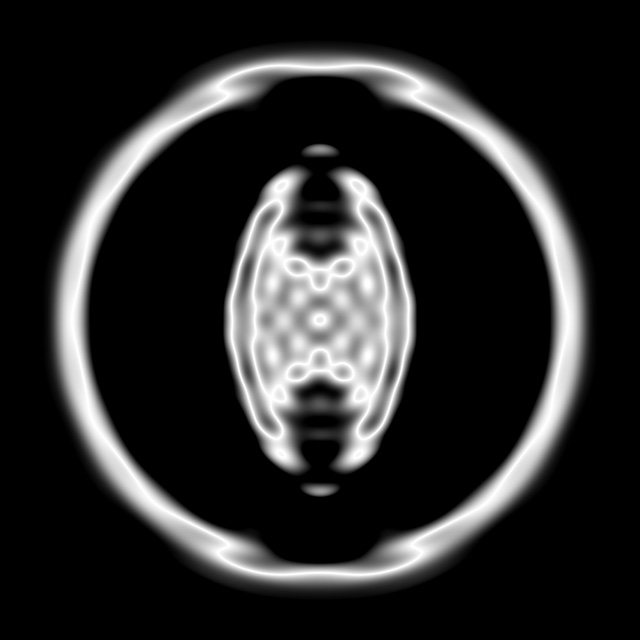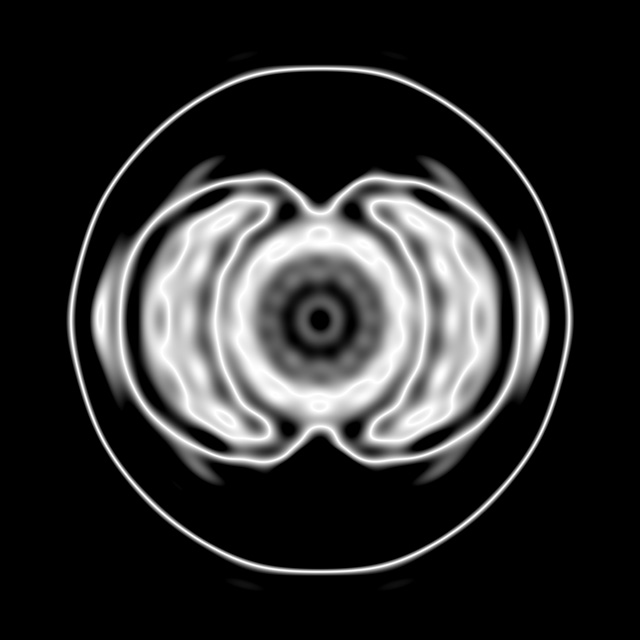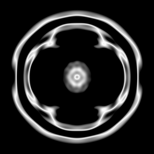 Various small prints that are part of the Cloud Drum grouping of prints. Each print represents the response of a virtual drum to being struck with a virtual mallet. For some prints the mallet was a geometrical shape (circular or rectangular); for others it was obtained by a shadow cast during the operation of the Cloud Drum installation.