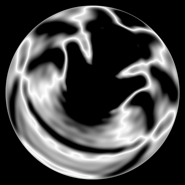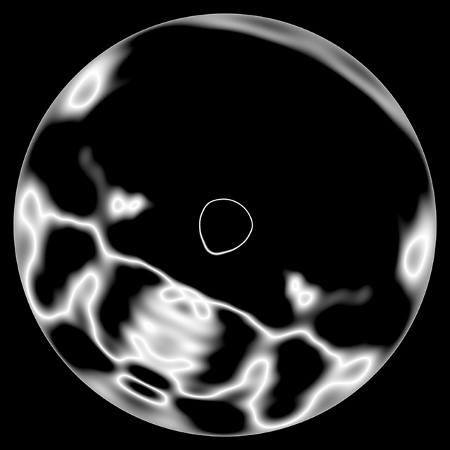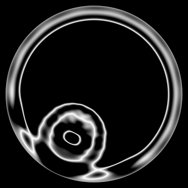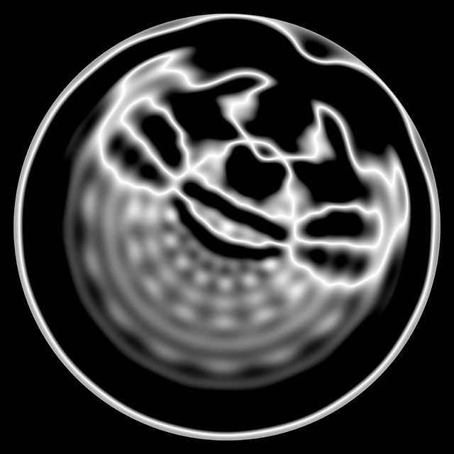 Part of the Cloud Drum grouping of prints. The Drum Mask prints form a sequence, showing successive stages in the response of a virtual drum to a single strike of a virtual mallet.