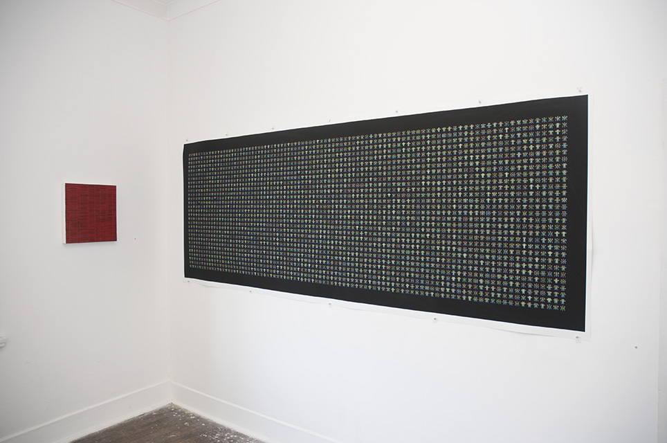 – Difference Engine 3. Shows 2,639 small patterns and their corresponding DNA. 100 x 300 cm. Edition of 3, 2012.