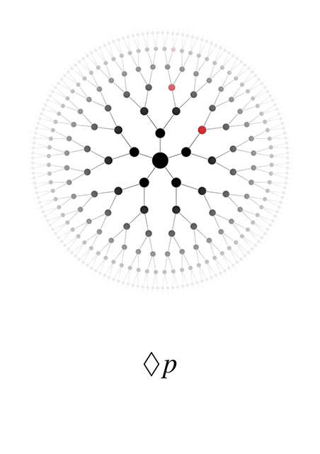 Consideration of the meaning of "necessary" and "possible" goes back to the ancient Greeks, and continued in philosophical and theological discussions; Leibniz used the idea that possible worlds are ideas in the mind of God in his discussion of the problem of evil. Early in the twentieth century, formal systems for working with notions of "necessary" and "possible" were developed under the name of "modal logic"; the approach using diagrams of possible worlds was developed in the 1950s and 1960s. "The Necessary and the Possible" presents the fourteen modalities of S4 and their notations as a logical found object.