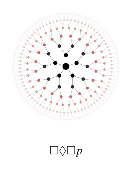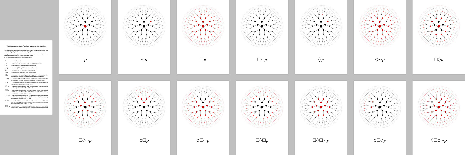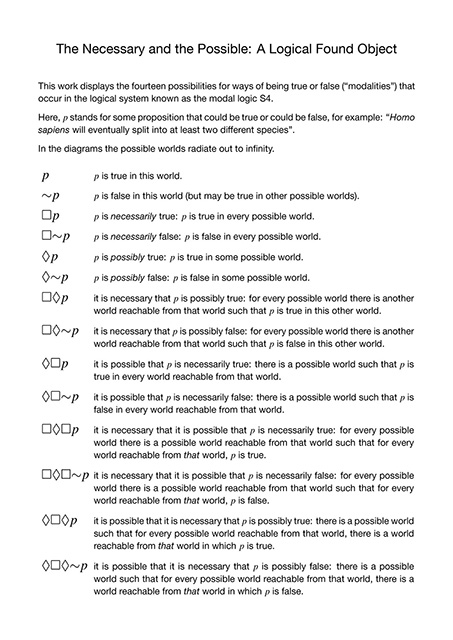 The Necessary and the Possible: A Logical Found Object consists of fifteen A3 panels. Fourteen of the panels show the fourteen possibilities for ways of being true or false (“modalities”) that occur in the logical system known as the modal logic S4; the remaining panel gives a key to the fourteen modalities.