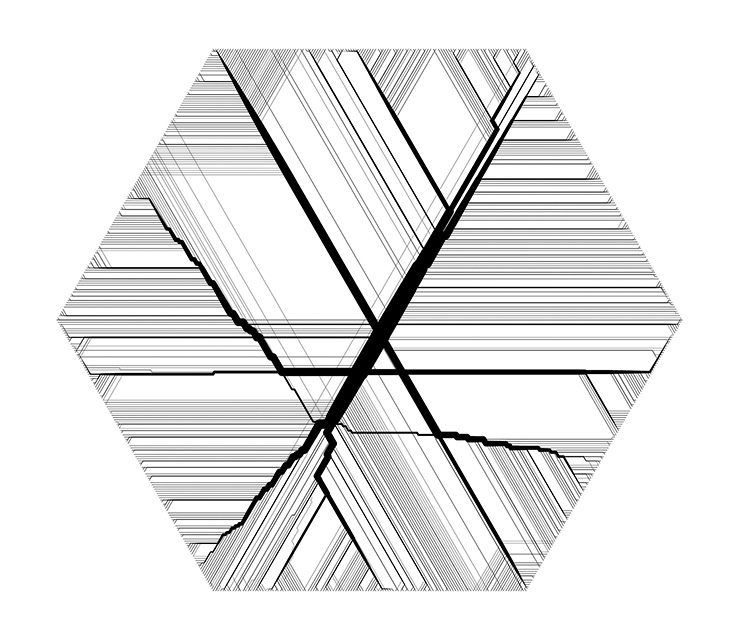 Other People's Paths is a diptych of digital prints. In both images, paths start at points around the perimeter of a hexagon and travel towards the diagonally opposite points. In the first image, Divergence, existing paths act as obstacles: new paths would rather go via untrodden territory than join in with existing paths. In the second image, Convergence, new paths find it easier to join in with existing paths than to strike out on their own.