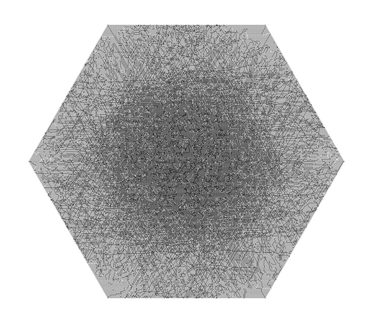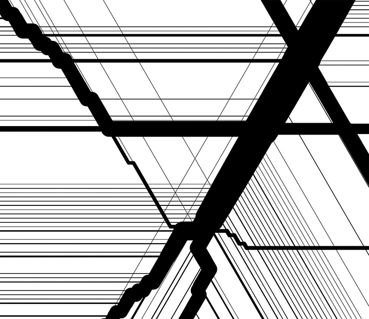 The images were made by a computer program written by the artist. The program uses the so-called A-Star algorithm, which was developed for robotics but has found wide application in computer games.